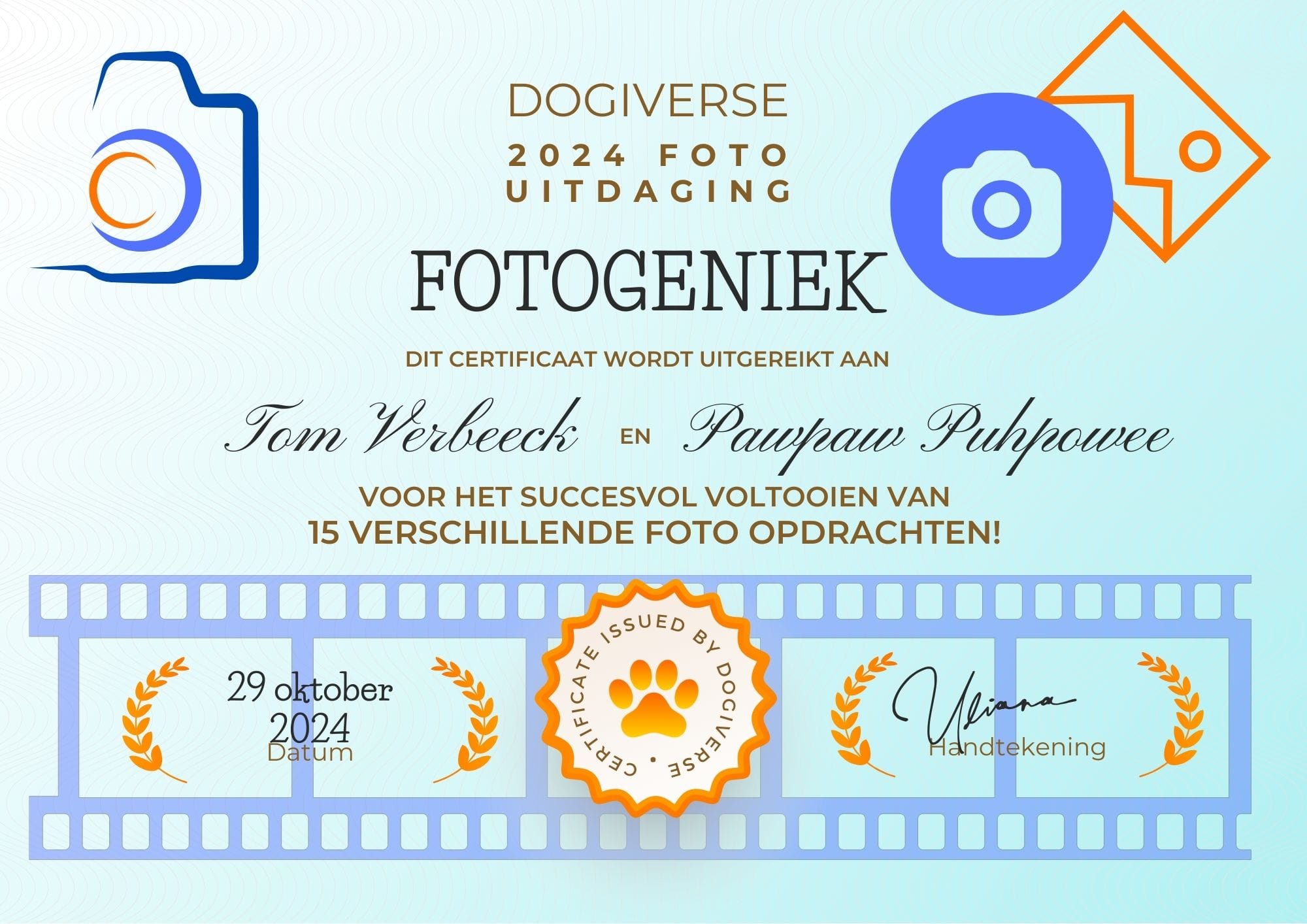 Het enige wat je moet is via email, naar dogiverse@protonmail.com, de link sturen waar we de foto's kunnen bekijken (facebook, je website, instagram, dropbox, google drive, onze facebook-groep...), samen met jouw naam en de naam van je hond. Binnen de 30 dagen krijg je dan het diploma via email toegestuurd als PDF die je zelf thuis makkelijk kunt uitprinten, inkaderen en tentoonstellen!