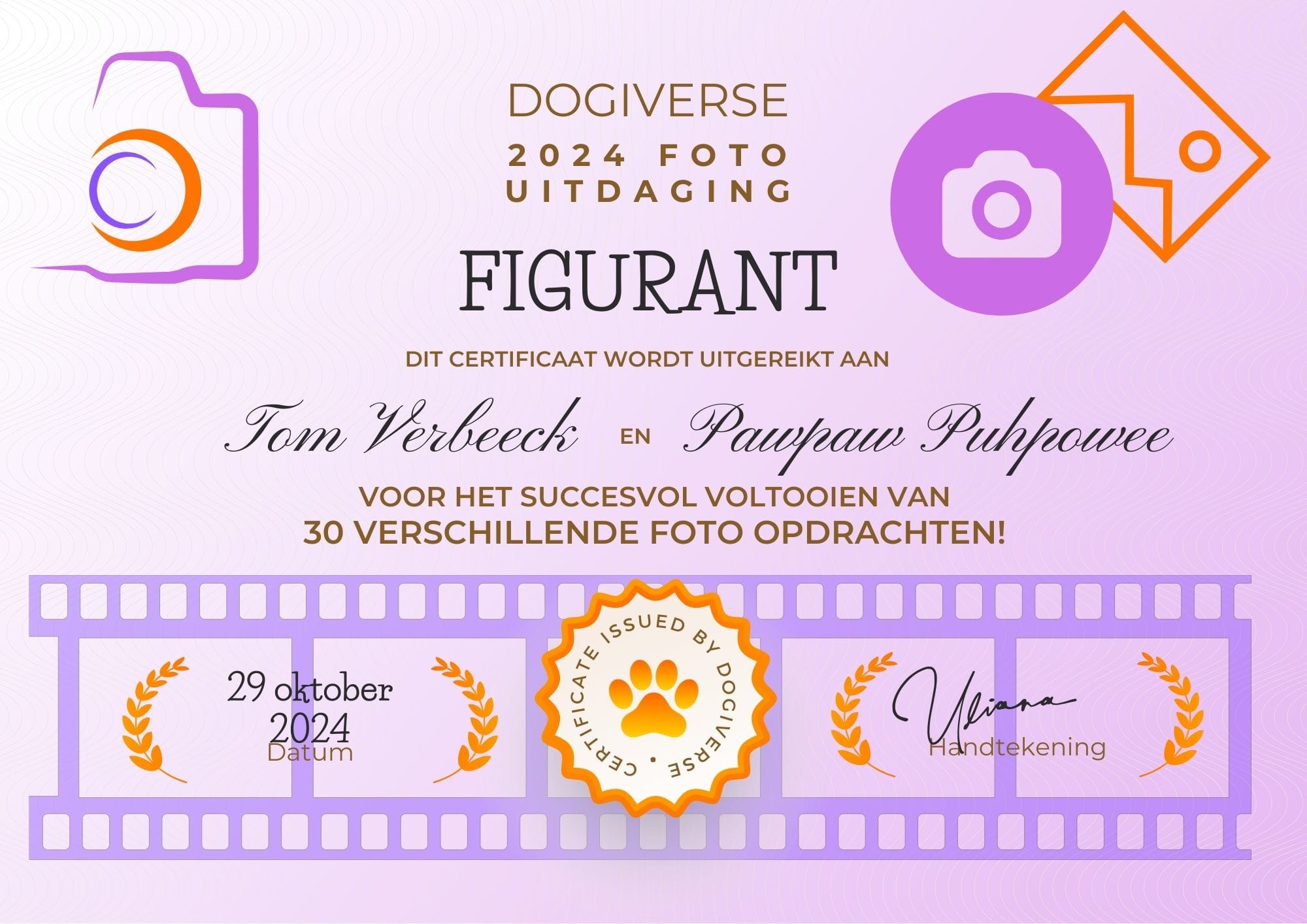 Als je hond 50 verschillende opdrachten (de 30 opdrachten van de vorige diploma's tellen hier ook mee) heeft volbracht, ontvang je het 2024 Fotomodel diploma!